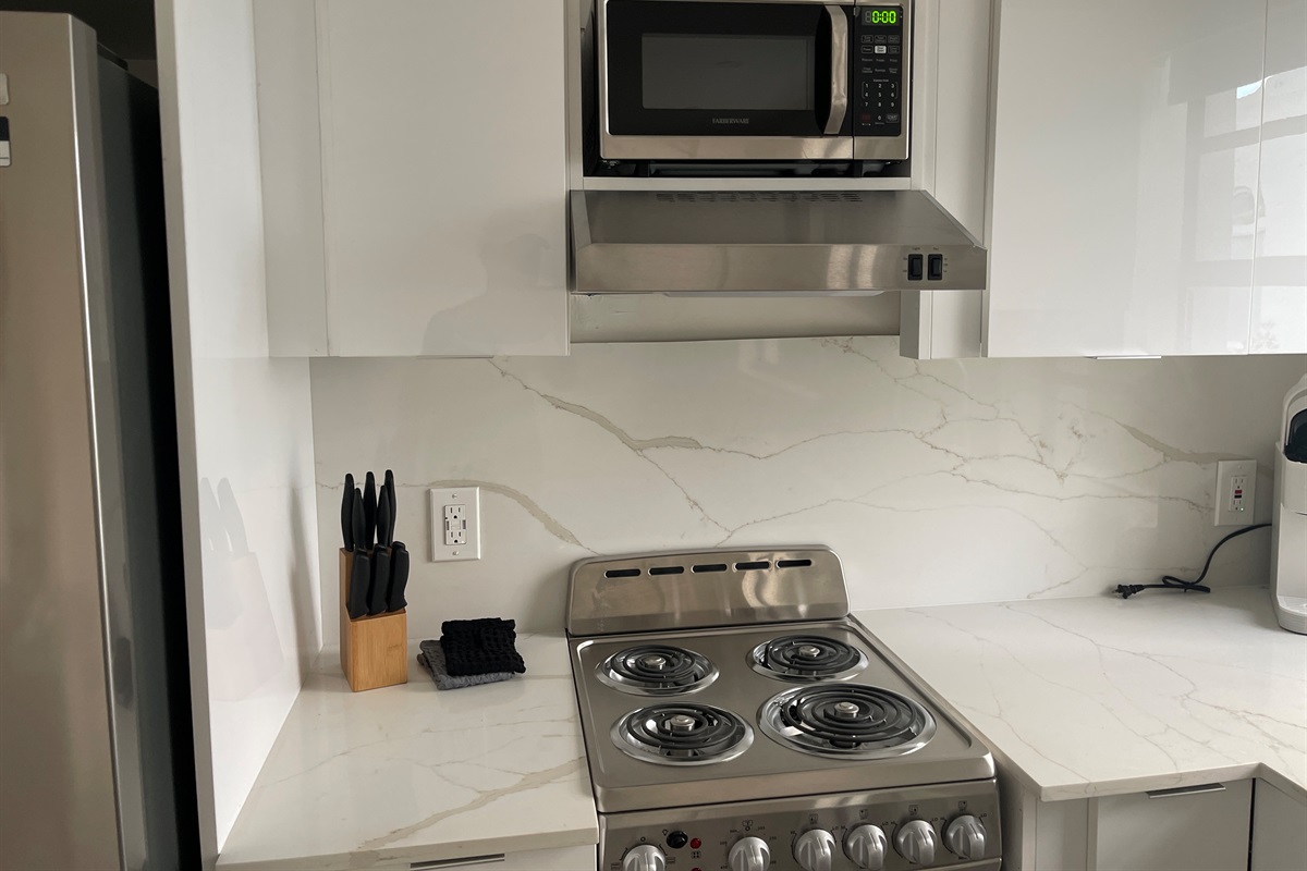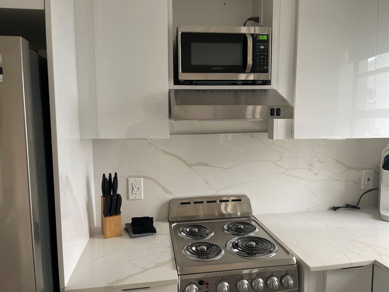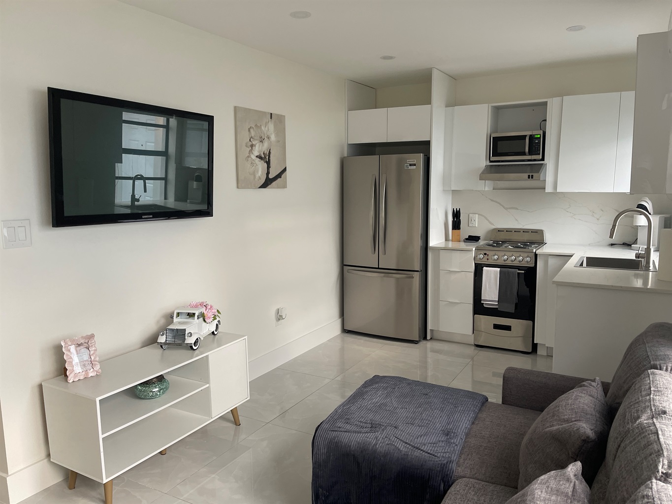 Inside, the space feels warm and inviting from the moment you arrive. The cozy bedroom features a comfortable queen bed, creating the perfect place to unwind after a day at the beach or exploring downtown. The living area offers additional sleeping with a sleeper sofa, ideal for couples, close friends, or small families looking for flexibility without sacrificing comfort. The kitchenette is sleek and functional, equipped with modern stainless steel appliances and everything needed for a quick bite before heading out.